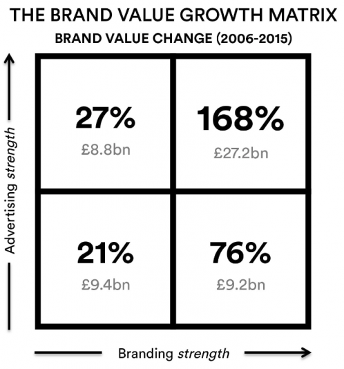 Las marcas percibidas por los consumidores como fuertes en publicidad pero con un branding débil, aumentaron tan solo un 27% de valor. Por otro lado, marcas percibidas con una fuerte publicidad y branding, aumentaron su valor un 168%.